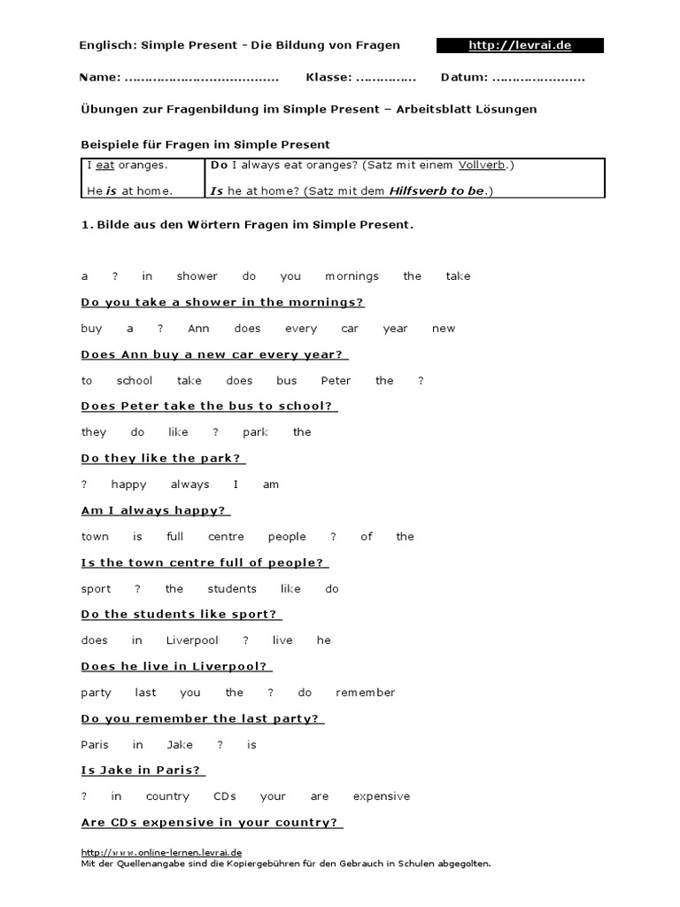 Simple Present 60 Fragen Uebungen Arbeitsblatt Loesung